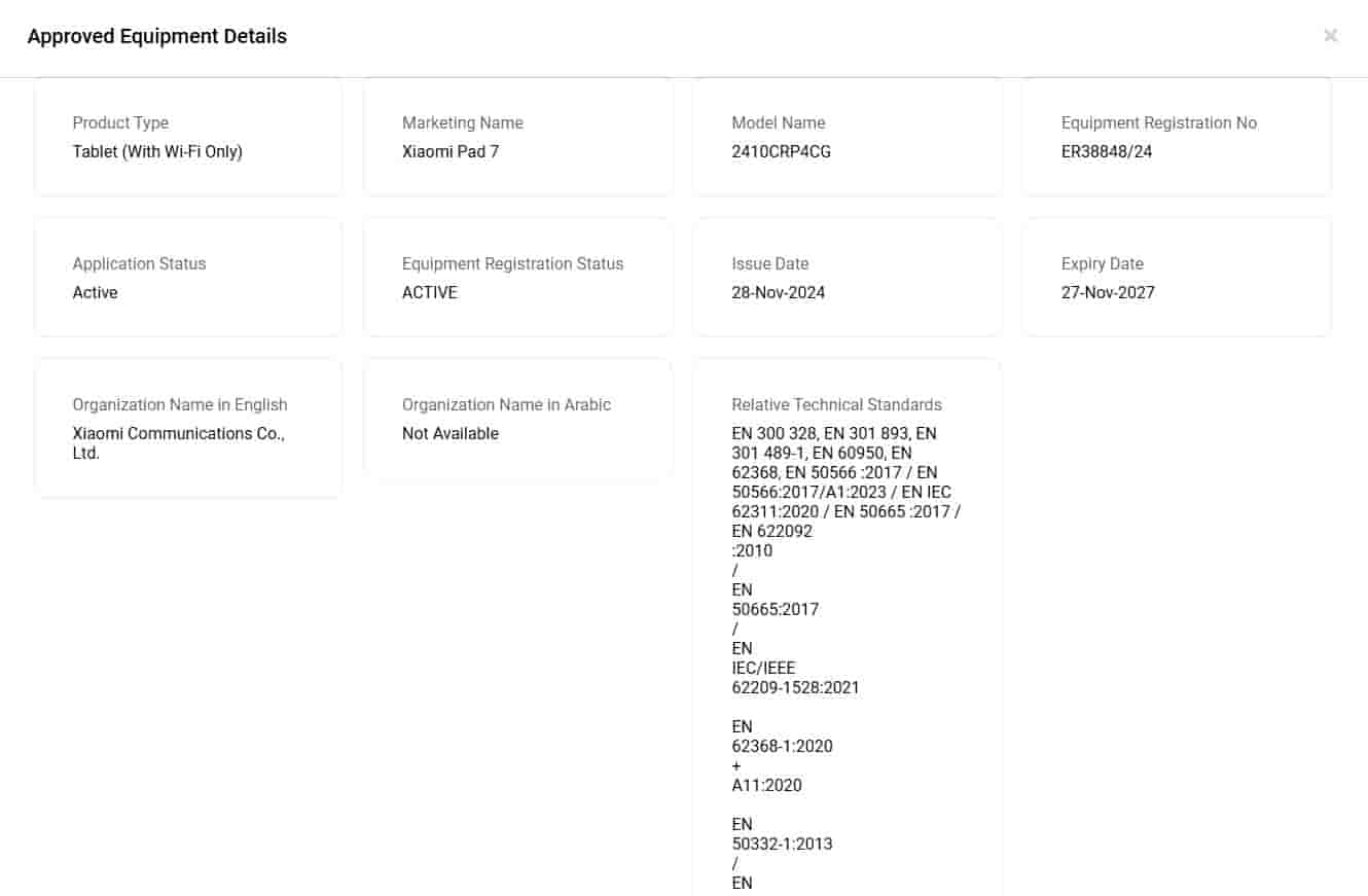 Today Xiaomi Pad 7 and Xiaomi Pad 7 Pro tablets have been spotted on the TDRA certification website with model numbers 2410CRP4CG and 24091RPADG respectively.
