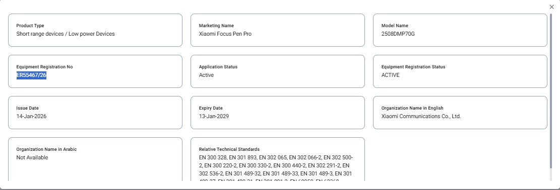 Lastly, Xiaomi Focus Pen Pro has also been listed on the TDRA certification with the model number “2508DMP70G” and was approved on 14th January 2026, similar to the above devices, with the equipment registration number “ER55467/26”. This stylus was launched alongside the Xiaomi Pad 8 series in China, and as per this new certification, it appears that it will also be introduced globally for the Xiaomi Pad 8 lineup.