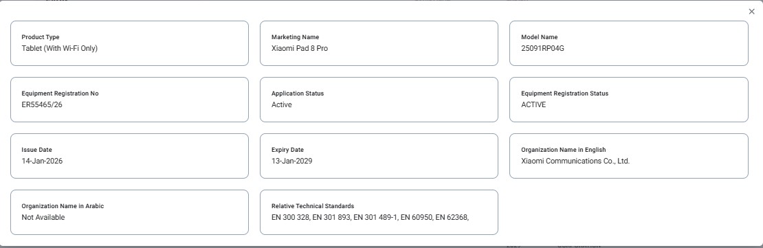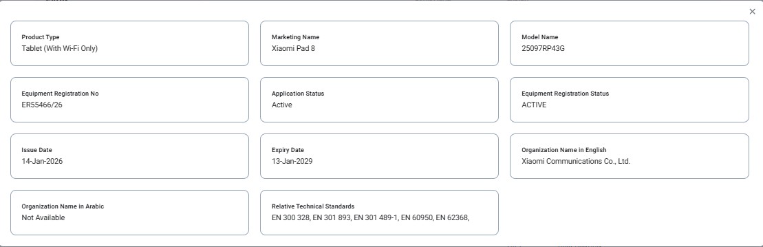Starting with the Xiaomi Pad 8, it has been listed with the model number “25097RP43G” and confirms that it was approved on 14th January 2026 with the equipment registration number “ER55466/26”, thus confirming that it will launch in the UAE market. Further, under Product Type, it shows “Tablet (With Wi-Fi Only)”, hinting that it will launch in a Wi-Fi-only option with no cellular connectivity. Other than this, the certification does not reveal any specifications as such.