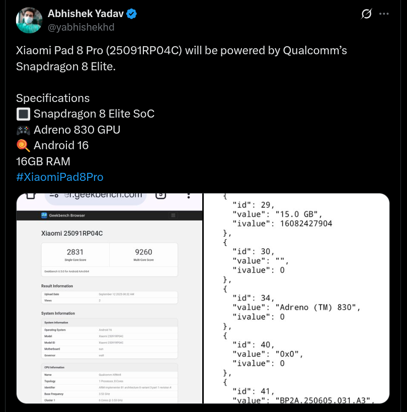 Xiaomi’s Pad 8 Pro tablet which carries the model number of ‘25091RP04C’ has made its appearance on the Geekbench database and it has attained 2831 points and 9260 points respectively in the single-core and multi-core performance tests. As per the Geekbench listing, the Xiaomi Pad 8 Pro tablet will be powered by the Qualcomm Snapdragon 8 Elite processor (standard version with 2x 4.32GHz-clocked cores + 6x 3.53GHz-clocked cores). The device will also be integrated with the Adreno 830 GPU, and it is revealed to offer the Android 16 operating system (with HyperOS 3 on top) out of the box. Also to note, it is the 16GB RAM variant of the device that has been listed on the Geekbench database.