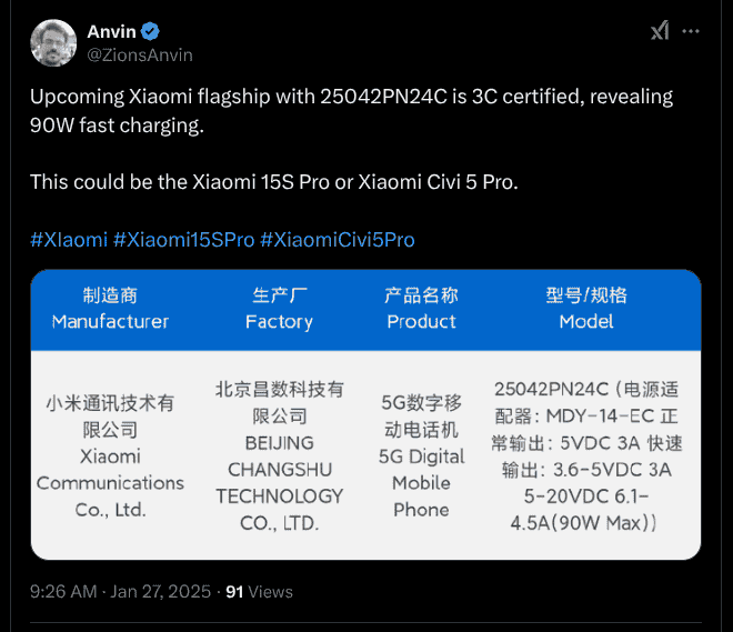 As per the latest 3C listing, it is the Xiaomi flagship smartphone (Chinese variant) with the model number – ‘25042PN24C’ that has appeared on the 3C certification database, and it has been listed as a 5G digital mobile phone. Additionally, a charging adapter with the model number – ‘MDY-14-EC’ has also been listed along with this upcoming smartphone, revealing that it will support a 90W wired fast charging feature. About the moniker of the 3C-listed smartphone, it is expected to be the Xiaomi 15S Pro or Xiaomi Civi 5 Pro model.