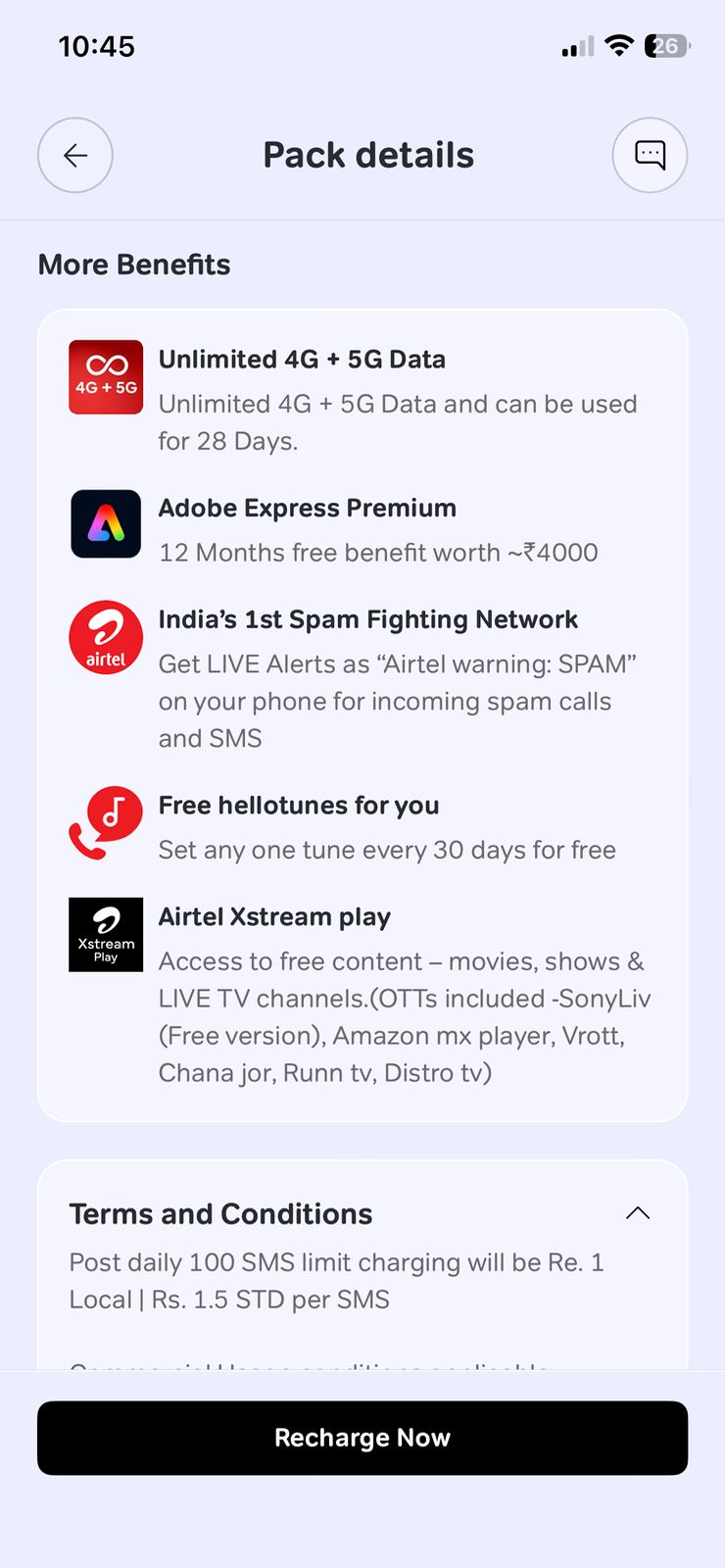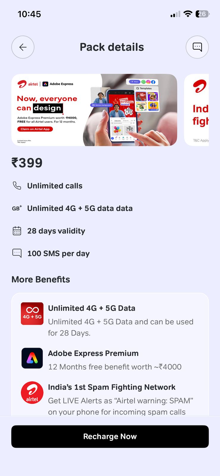 Airtel has now changed the data benefit for the ₹399 and ₹499 recharges. Earlier, both recharges came with a limit on data, but now both will offer unlimited 4G and 5G data. However, an FUP (Fair Usage Policy) is applied, meaning that after you have consumed the commercial limit of 300GB, the data speed will be reduced to around 1 Mbps. Although both plans offer a validity of 28 days, Airtel calculates the FUP based on 30 days, meaning the 300GB data limit is calculated over a 30-day period.