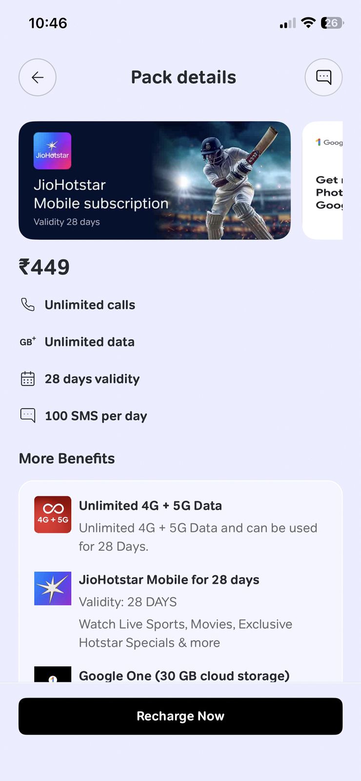 Validity: 28 days. Watch live sports, movies, and Hotstar specials. - Google One (30GB Cloud Storage)