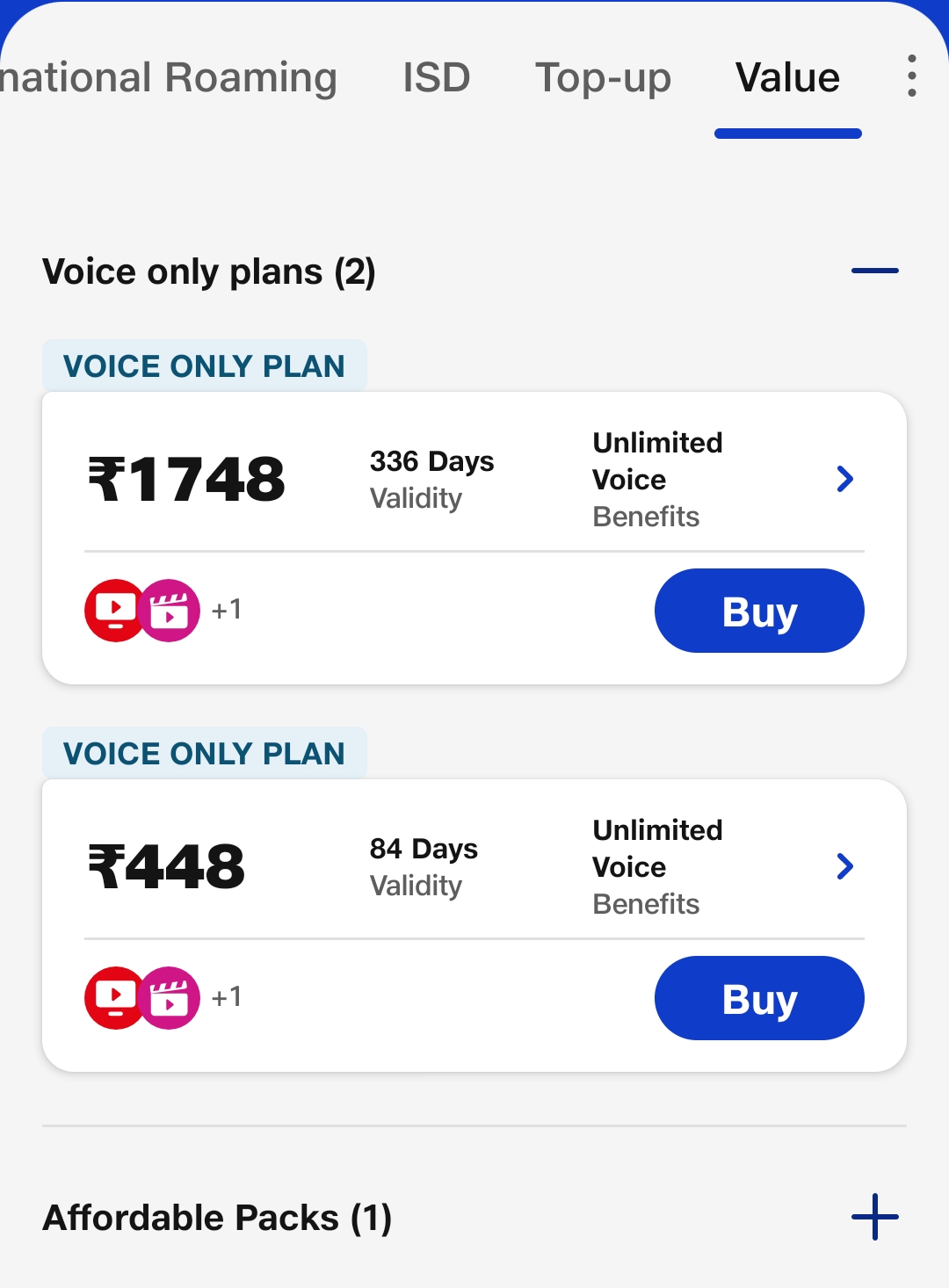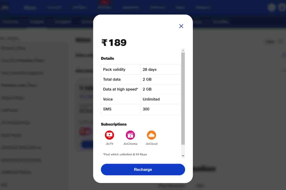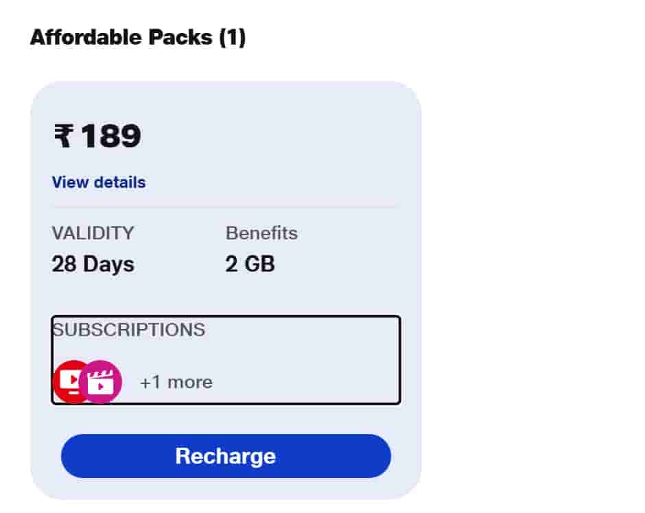 If you now go to the Jio app or website and click on the Value category you will see two voice-only plans while there is also a new sub-category Affordable Packs in which you will find a Rs 189 plan. This plan arrives with 28 days of validity and offers benefits like- unlimited voice calling, 300 SMS, 2GB data, and JioTV, JioCinem, and JioCloud subscriptions.
